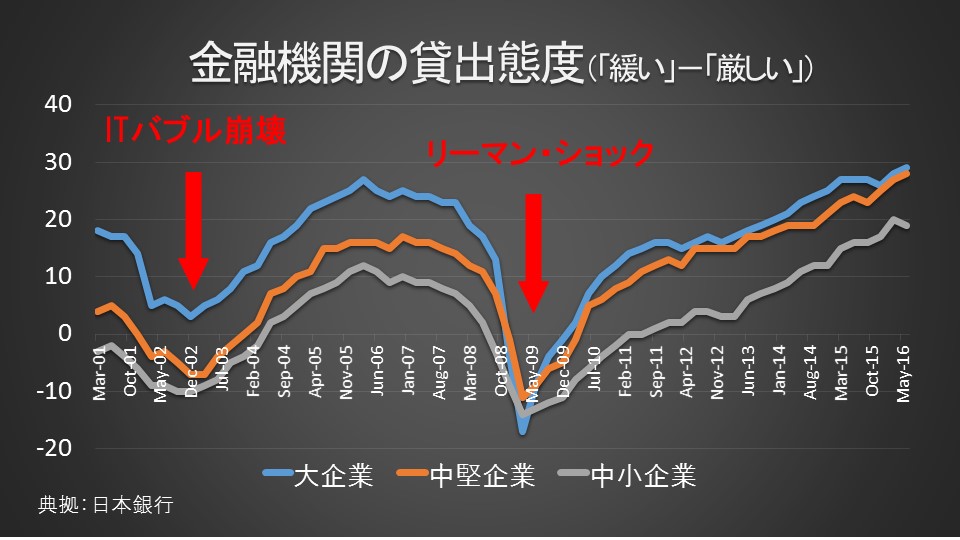一方、下の図の通り、金融機関の貸出態度(「緩い」-「厳しい」)をみますと、かなり改善していることがわかります。
