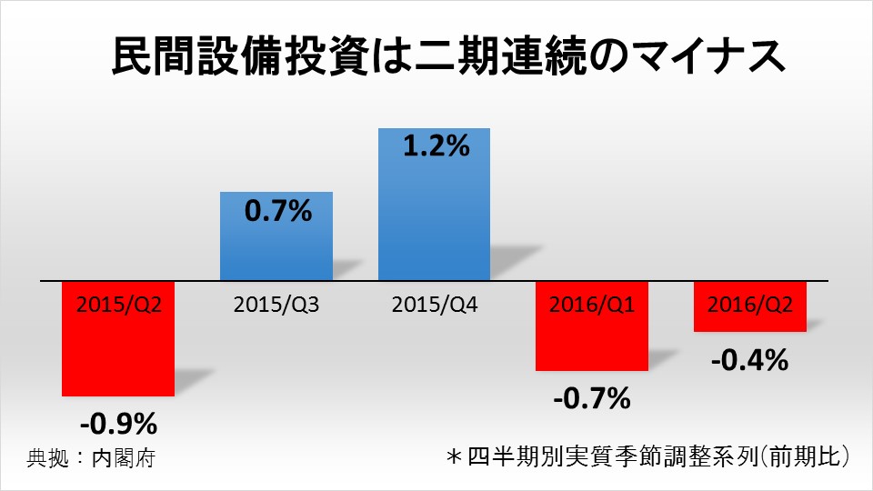 とりわけ数字が最も弱くでたのが民間設備投資で、マイナス0.4%。実は二期連続のマイナスです。