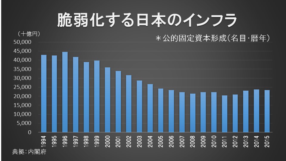 グラフは、我が国のインフラが脆弱化しているぞぅ、と叫んでおります。